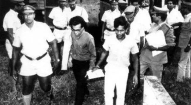 (මෙම ඡායාරූපයෙන් දැක්වෙන්නේ, ජන ඝාතක රණසිංහ ප්රේමදාස ගේ නිල අලුගෝසුවන් තමා ව අනීතික ලෙස ඝාතනය කරන බව දැන සිටිය දී ඉන්ද්රානන්ද සිල්වා සහෝදරයා අත රැඳි හමුදා කැමරා කාචයට හමුදා අත්අඩංගුවේ සිටි නිරායුධ රෝහණ විජේවීර සහෝදරයා දෙතොල මත රැඳී මද සිනහවක් සහිතව 1989 ඉල් මස 12 දින රාත්රියේ මුහුණ දුන් අභීත විලාශය යි)