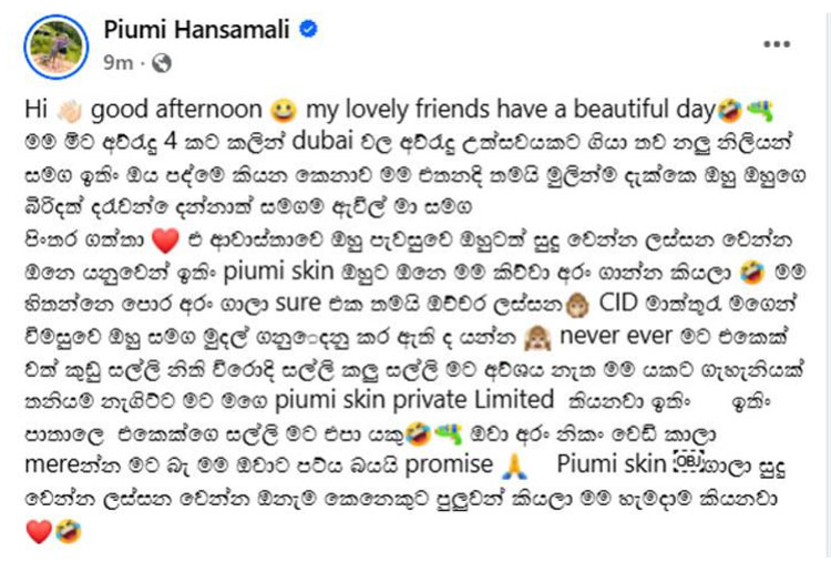 තම ෆේස්බුක් ගිණුමෙන් අදහස් දක්වමින් පියුමි තවදුරටත් ප්රකාශ කරන්නේ තමන් කිසිම අවස්ථාවක කෙහෙල්බද්දර පද්මේ සමග මුදල් ගනුදෙනු සිදු කර නොමැති බවයි. එසේම තමන්ට කිසිවෙකුගේත් නීති විරෝධි කලු සල්ලි අවශ්ය නොවන බවයි.
