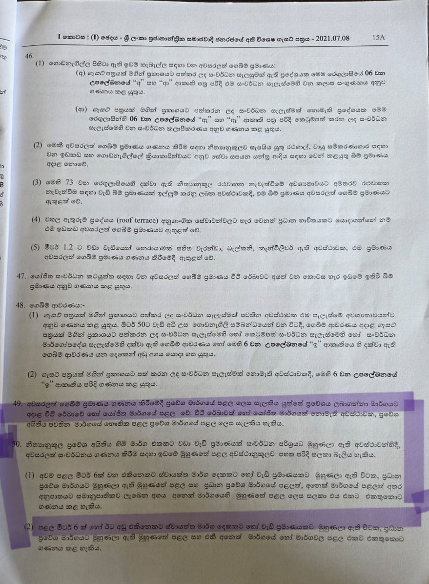 එසේ සදහන් කර ඇති අවස්ථාවක උස ගණනය කිරීමට එම මාර්ගයේ මුහුණත පළල අදාල කරගත නොහැක. මෙම ඉඩමෙ කුමන ස්ථානයක වුව මිටර් 40 මුහුණත පළලක් නොමැත. ඒ අනුව ලබා දි හැකි උපරිම උස මිටර් 50 පමණි. ඉහත අවස්ථා දෙක අනුව මෙම ඉඩමට අදාල උස වන්නේ මිටර් 50 පමණි .