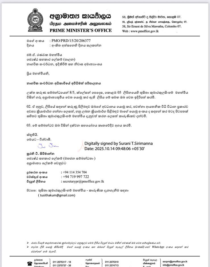 • අග්රාමාත්ය කාර්යාලය: පැමිණිල්ල සම්බන්ධයෙන් අවධානය යොමු කර ඇති අතර, අක්රමිකතා තිබේ නම් නීතිය ක්රියාත්මක කිරීමට අවශ්ය පියවර ගැනීමට අදාළ අංශ දැනුවත් කර ඇති බව.
