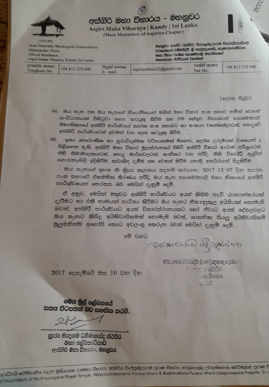 මහජනතාවගේ භක්තිය පාවිච්චි කරමින් මුදල් උපයමින් පවුල නඩත්තු කරන මෙම පුද්ගලයාව වහාම ශාසනයෙන් නෙරපා හරින ලෙසත්, උපැවිදි කරන ලෙසත් ඉල්ලා ඔහු මෙම පැමිණිල්ල ඉදිරිපත් කර ඇත. තිරිසන් ලිංගික සබදතා පවත්වන අයෙකු වන වජිර ශ්රී නමින් පෙනීසිටින මෙම තැනැත්තා ගේ අකටයුතුකම් නැවත්වීමට වහාම මැදිහත් වන ලෙසට කැලුම් අමරසිංහ විසින් පරීක්ෂණයක් ඉල්ලා ඇත.