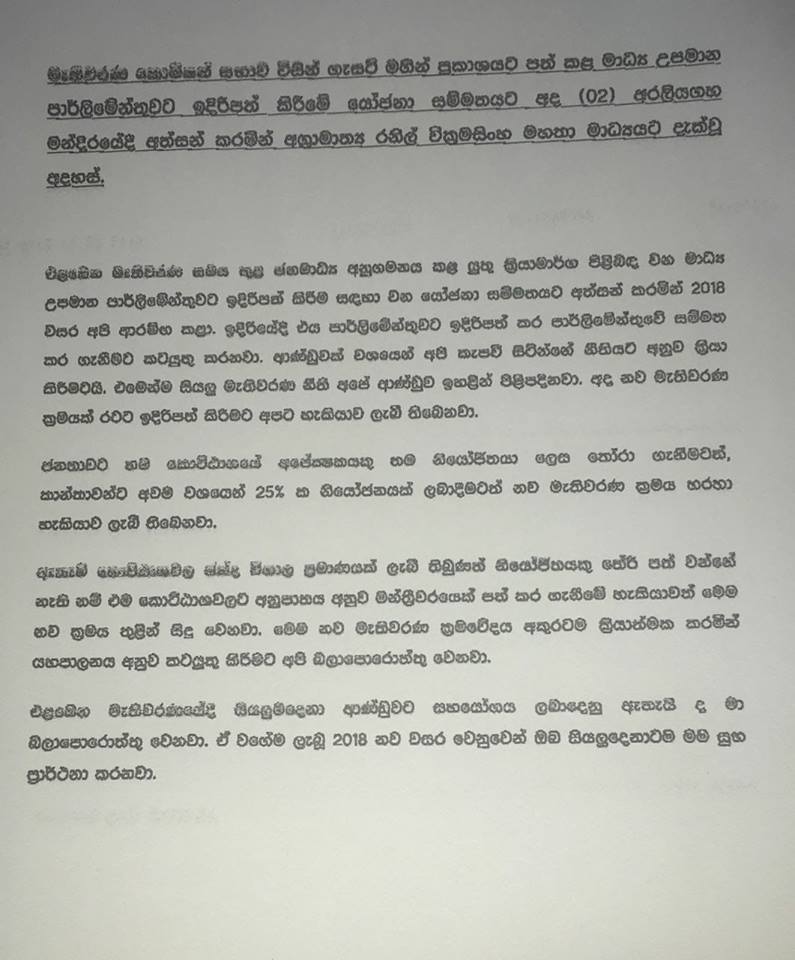ඒ බව සඳහන් කරමින් මැතිවරණ කොමිසම වෙත පැමිණිලි කර ඇති අතර එහිදී අවධාරණය කර දක්වා ඇත්තේ අග්රාමාත්ය කාර්යාලය “මැතිවරණ කොමිෂන් සභාව විසින් ගැසට් මඟින් ප්රකාශයට පත්කළ මාධ්ය උපමාන මාස තුනක් ඇතුළත පාර්ලිමේන්තුවට ඉදිරිපත් කිරීම ව්යවස්ථාමය අවශ්යතාවක්” වන නමුත් එය “මැතිවරණ කොමිෂන් සභාව විසින් ගැසට් මඟින් ප්රකාශයට පත්කළ මාධ්ය උපමාන පාර්ලිමේන්තුවට ඉදිරිපත් කිරීමට අත්සන් තැබීම” යැයි දක්වා එය මාධ්ය අවස්ථාවක් බවට පත්කර ඇති බවය.