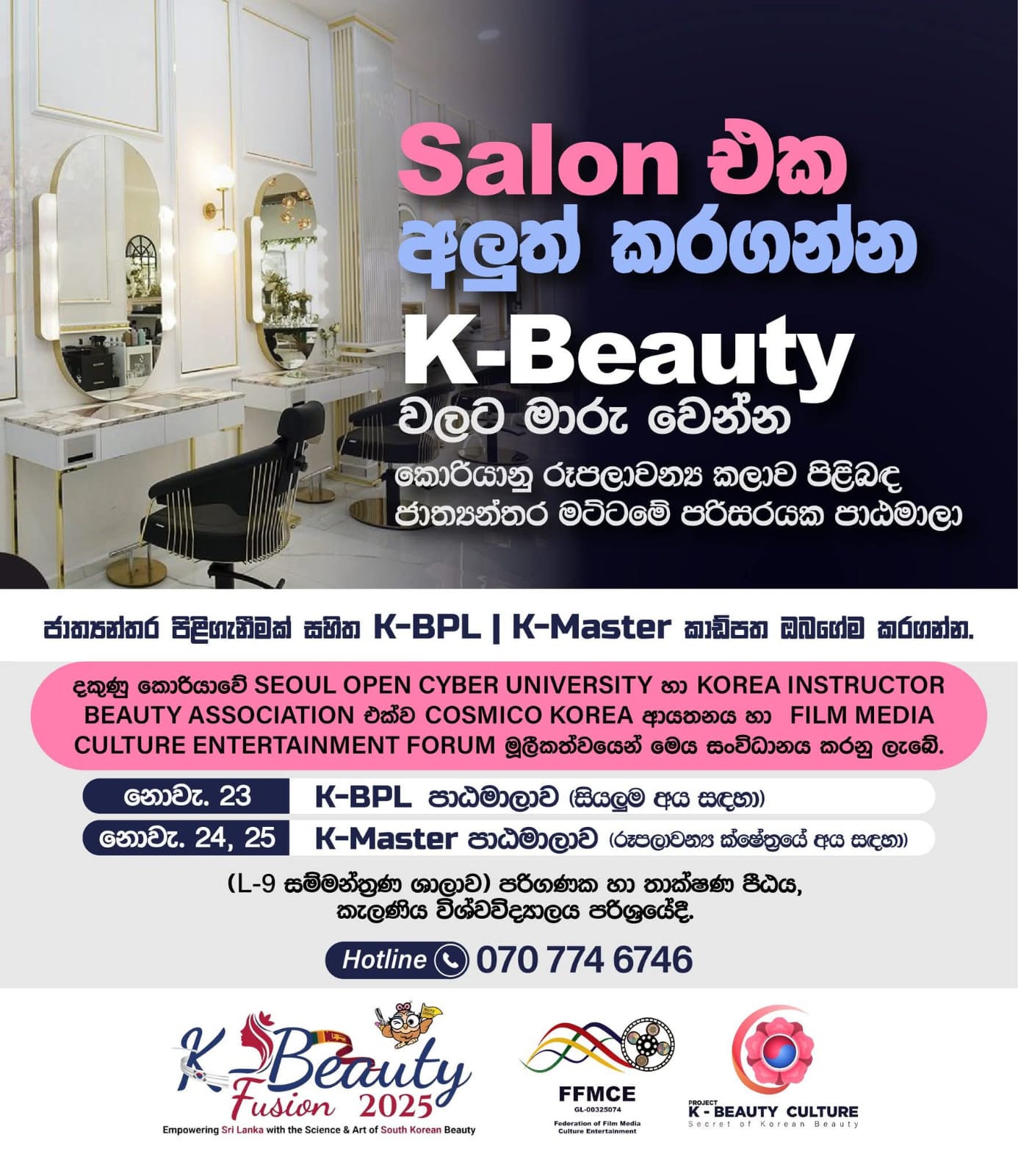 දකුණු කොරියානු K-BEUTY රූපලාවන්ය සම්බන්ධ එරට OPEN CYBER UNIVERSITY, SU SONG UNIVERSITY, INTERNATIONAL BEAUTY INSTRUCTOR ASSOCIATIONS ,COSIMICO KOREA ආයතනයන්හී ආචාර්ය මහාචාර්යවරු සහ රූපලාවන්ය ක්ෂේත්රයේ ප්රවීනයන් මෙරටට පැමිණෙන අතර එහි ශ්රි ලංකාවේ සම්බන්ධීකරණය ලෙස FEDERATION OF FILM MEDIA CULTURE ENTERTAINMENT ආයතනය කටයුතු කරයි.