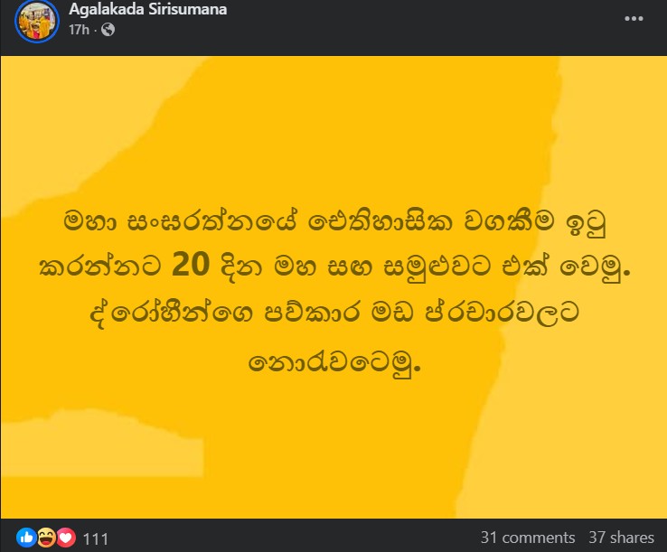 සංඝ සමාජයේ ඓතිහාසික වගකීම ඉටුකරන්නට 20වෙනි දා කොළඹට එන්නැයි මහාචාර්ය අගලකඩ සිරිසුමන හාමුදුරුවන් සටහනක් තබා තිබෙනු දුටුවෙමි. මෙය දුටු මම පුදුමයට පත් වීමි. මුන්නාන්සේ මටත් උපාධි සහතිකයක් දුන් කොළඹ සරසවියේ ම ශාස්ත්ර ගවේෂකයෙකි. එහි සිංහලාංශයේ ඉහළ ම තනතුර දක්වා ගිය ගුරුවරයෙකි.