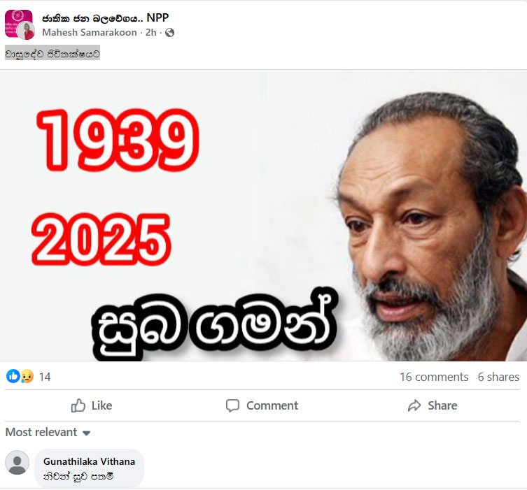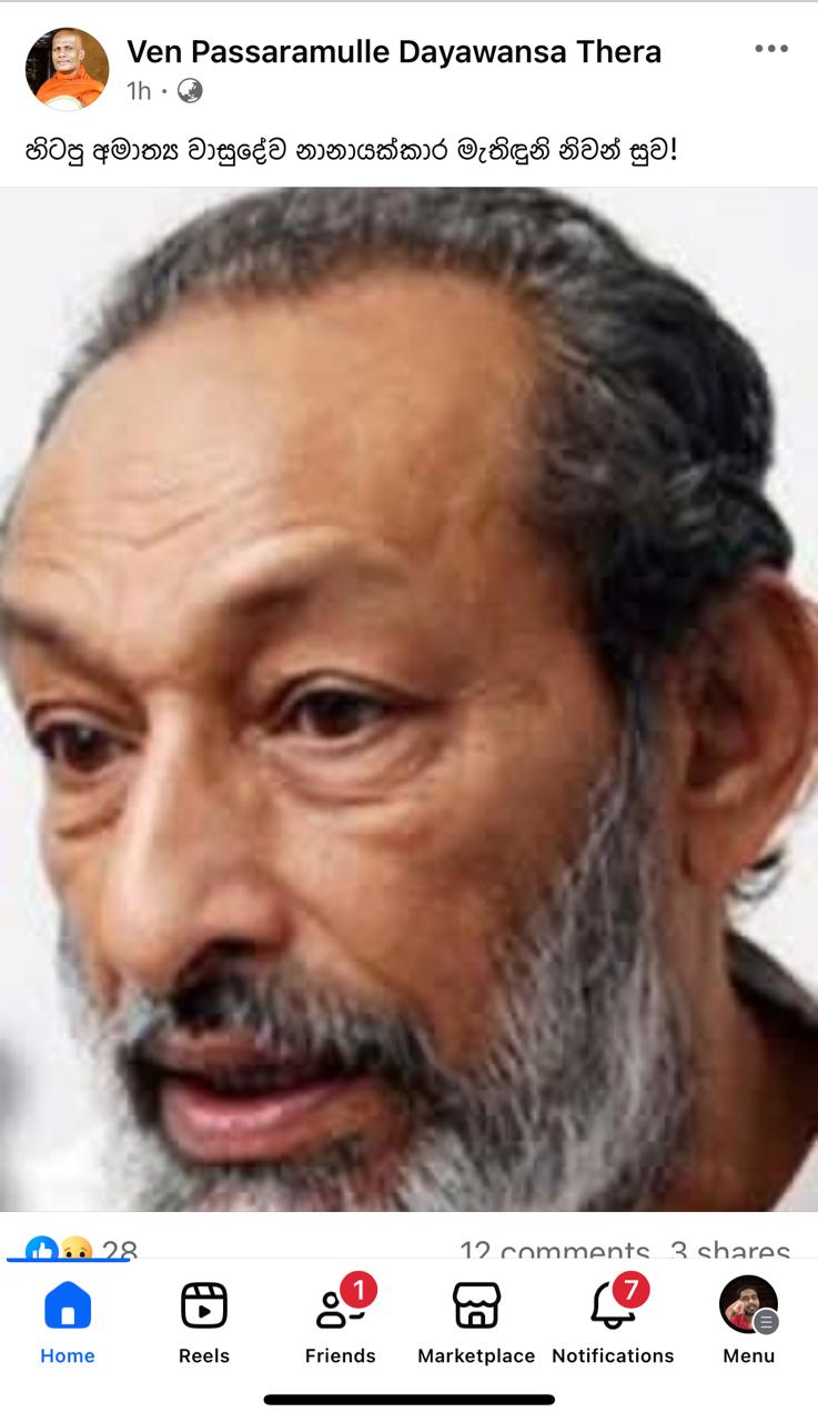 හිටපු පාර්ලිමේන්තු මන්ත්රී වාසුදේව නානායක්කාර ජිවිතක්ෂයට පත්ව ඇති බවට සමාජ මාධ්ය තුල පළවූ වාර්තා කිහිපයක් පහතින්
