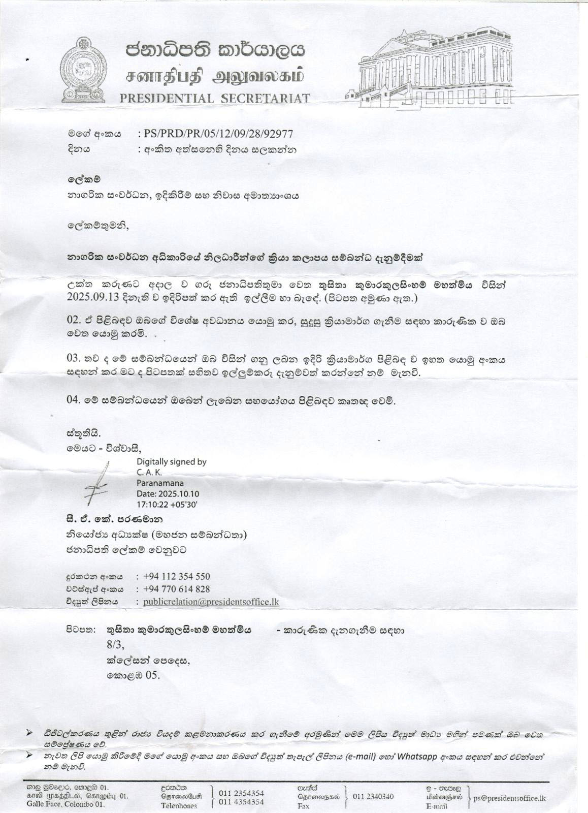 ක්ලේසන් පෙදෙස් නේවාසිකයාගේ පැමිණිල්ලට ප්රතිචාර දක්වමින් ජනාධිපති කාර්යාලය (2025.10.10 දිනැතිව) සහ අග්රාමාත්ය කාර්යාලය (2025.10.14 දිනැතිව) ලිපි මගින් දැනුම් දී ඇත්තේ: