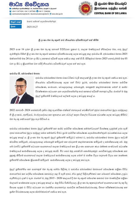 ඒ පිළිබදව වැඩිදුරටත් අදහස් දක්වන මහ බැංකුවේ මානව සම්පත් දෙපාර්තමේන්තුව නිකුත්කර ඇති මාධ්ය නිවේදනය මතු පළවේ.