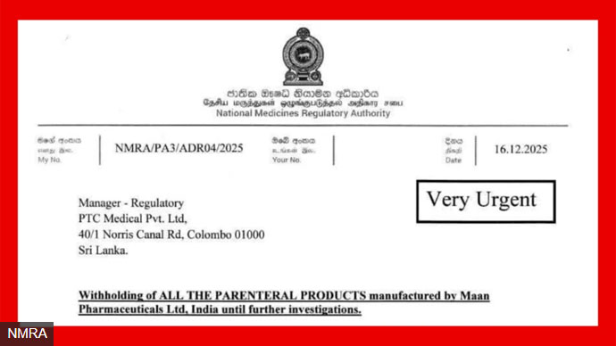 මේ අතර, ජාතික ඖෂධ නියාමන අධිකාරිය විසින් දෙසැම්බර් 12 වන දින "ඉතා හදිසි" ලේබලය යටතේ නිකුත් කරන ලද ලිපියක, "Maan Pharmaceutical Ltd, India" යන නිෂ්පාදකයාගේ, "Ondansetron Injection USP 8 mg/4 mL (Ondanman 8)" යන ඖෂධයේ "OD24021E, OD25009E, OD25024E, OD25023E" යන කාණ්ඩ රෝහල්වල සහ පුද්ගලික අංශයේ ලබා දීම අතිහිටුවන ලෙස දන්වා තිබේ.